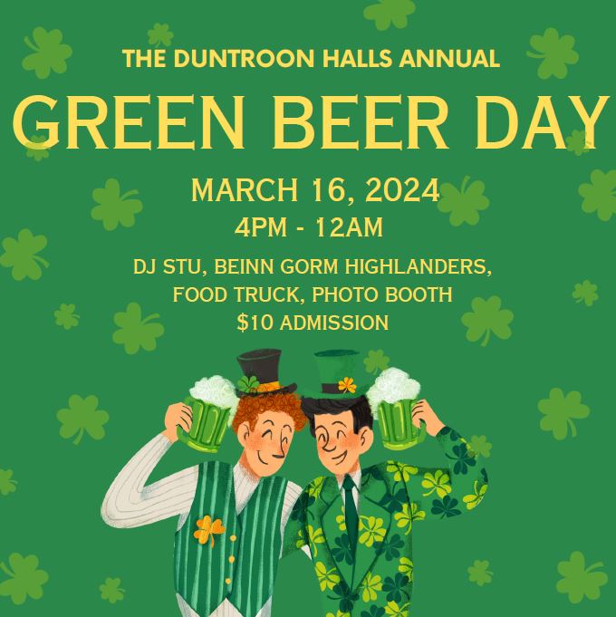 Irish folk and folk who think they are Irish are invited to the 5th Annual Green Beer Day at the Duntroon Hall on Saturday March 16th.