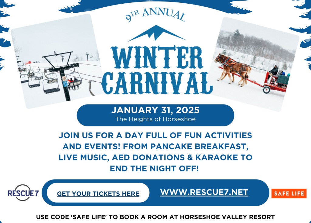 There will be a pancake breakfast, horse drawn sleigh rides, skiing, snow shoeing, puck drop, food/wine/beer tasting, silent auction, live music and a night of Karaoke! You don’t have to be a skier to enjoy this amazing day. If you wish, you can come the night before and/or stay on the day after for more fun. Accommodations available across the road at Horseshoe Resort – only ONE night stay required (Reservations: 1-800-461-5627) with special pricing using the code Safe Life 2025. Feel free to invite family, friends, colleagues and/or clients to this fun filled day.