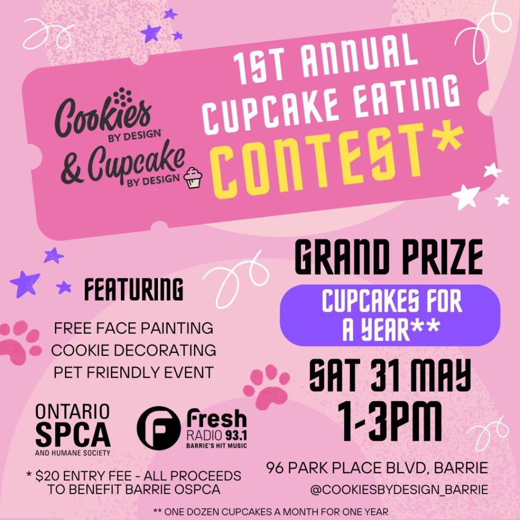 1st Annual Cupcake Eating Contest Where Cookies & Cupcakes by Design, 96 Park Place Blvd. , Barrie Map When May 31/25 01:00 PM - May 31/25 03:00 PM Age All Website https://www.facebook.com/share/16LPpGbqKs/