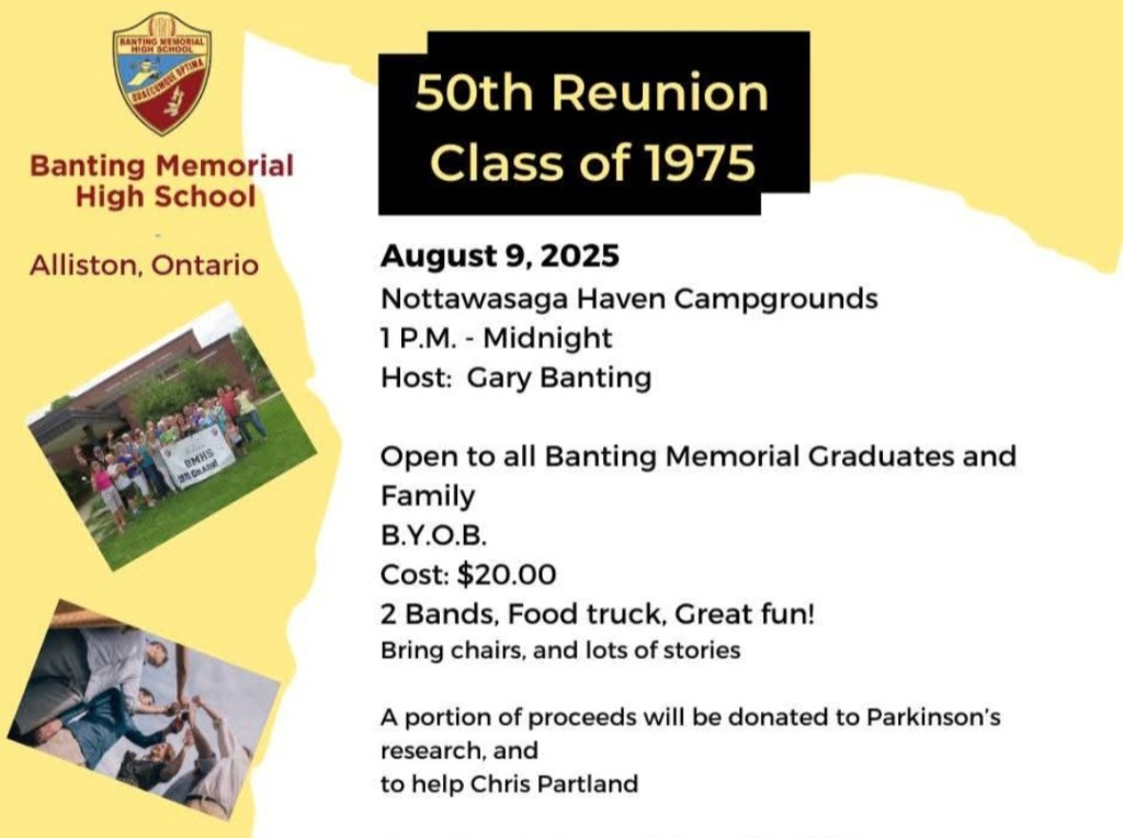 Banting High School Reunion for all students or staff. August the 9th at the Nottawasaga Haven campground 5832 6 th line Essa starting at 1 pm till midnight. Egbert LOL1NO. 705 333 5858. Call Gary Banting This event is to celebrate our surviving High School to the the present. 44 years ago we had the 81 and 82 picnic for bands and Oliver Heaviside headling!!! Since then many health issues have affected us. 20 dollars gets you to pay expenses and to support Parkinson’s disease that has unfortunately has Chris Partland in need of medications to control his symptoms ! Food will be sold , byob and lawn chair. Corn burgers dogs and fries. We have three bands booked with the Partland brothers playing. This reunion is get in touch with your past and present. And celebrate life . Join us and support our cause to Help fight Parkinson’s and Dementia that has affected Chris Partland and Pat Kennedy. See you here on the the 9th . Graduation diplomas are accepted at the door
